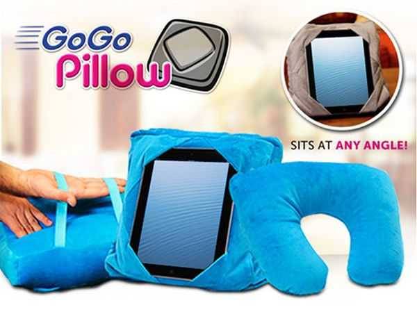 As Seen on TV Go Go Pillows! Take it everywhere, works with any tablet and works as a pillow, too! The GoGo Pillow works on any surface and works as a backpack so you can take your tablet with you, enabling you to use your tablet comfortably wherever you are. The patented multi-slot design means your tablet is locked and securely in place wherever you're using it and it works with every size tablet, too! The plush, luxurious GoGo Pillow folds up into a travel pillow that provides support and comfort so you can catch up on your sleep when you're not using your table. Allows easy access to power cord and earphone sockets.