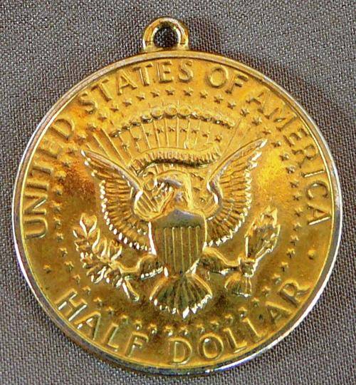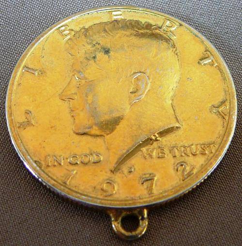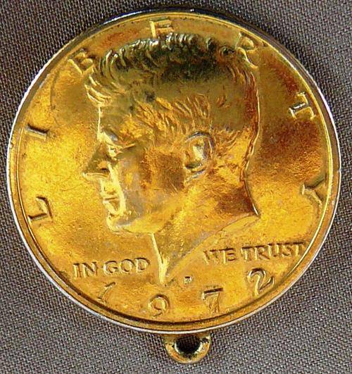 This Gold Coloured Half Dollar has the head of President JF Kennedy on one side and is dated 1972. It is 32 mm in diameter and weighs 12 grams.