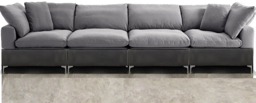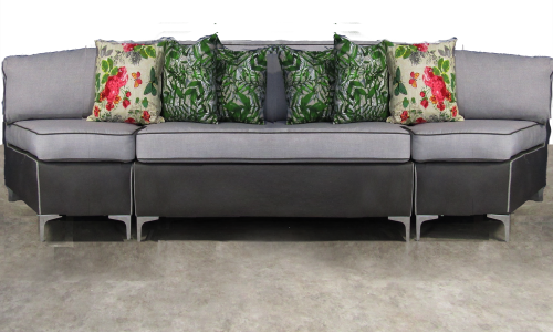 2 very different quality textiles combined to create 1 very Modern Plush Sofa. Combination of Dark Pastel Marina Vinyl Grey and Cotton Tween