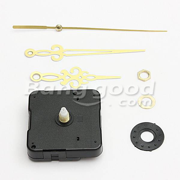 Package weight: 0.05 kg Gold Hands DIY Quartz Wall Clock Spindle Movement Mechanism Feature: Material: Plastic + metal Color: Gold Hands, Black Case Easy and simple design Great for repairing, replacing or making a clock Powered by 1 AA battery (not included) Dimension: Movement size: About 55 x 55 x 16mm / 2.16 x 2.16 x 0.63 inch Hour hand length: 74 mm / 2.91 inch Minute hand length: 101 mm / 3.97 inch Second hand length: 132 mm / 5.20 inch Thread length: Approx 8 mm / 0.32 inch Package includes: 1 x Quartz clock movement 1 x Second hand 1 x Minute hand 1 x Hour hand 1 x Nut 1 x Rubber Washer 1 x Metal Washer