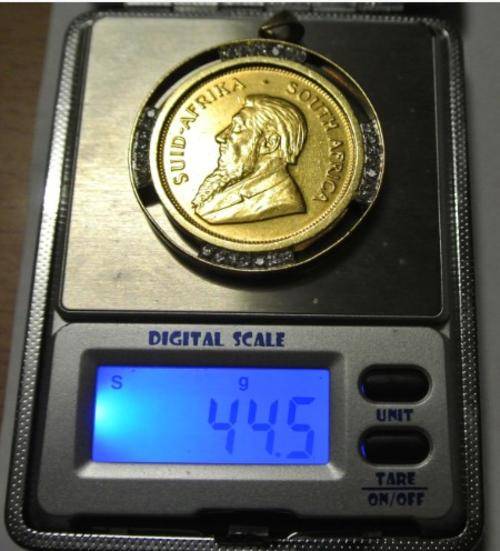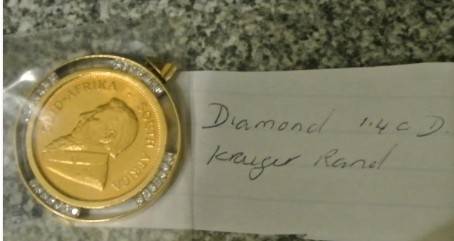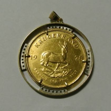 A beautiful 1978 Gold(1 Once Kruger ) gold and diamond coin pendent the diamonds add up to +/- 1.4 ct and the outer ring of the coin is 9ct and the coin 22ct,pleases note only courier or hand collect only!!!!