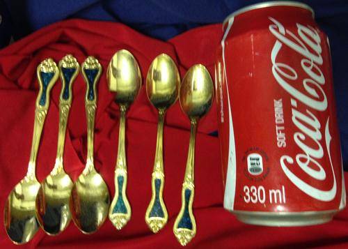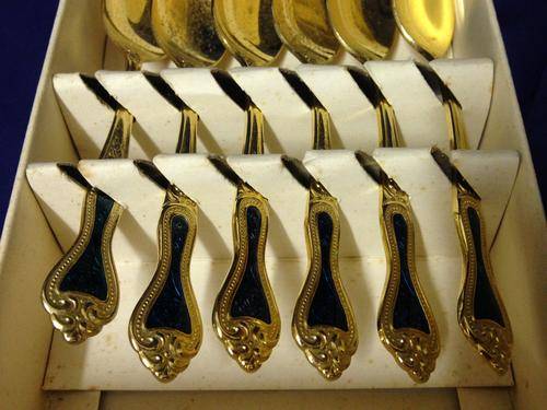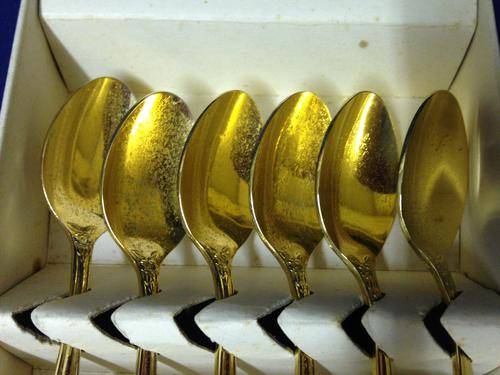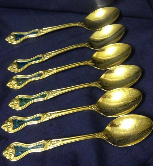 THEY HAVE HANDLES WHICH HAVE BLUE[GREENISH LOOK] DECOR ON -GOLD PLATED STAINLESS VINERS TEA SPOONS-