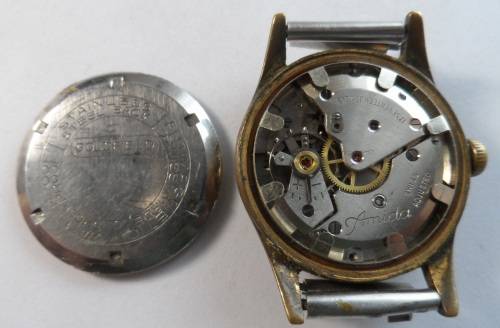 Goldfield Manual Watch 32469. Not running, for spares/repairs, parts might be missing? No strap. Watch has some wear/marks/scratches. Crystal damaged scratched. Crown rotates, hands move. Diameter of case excluding crown: 29mm. Movement marked: Amida Swiss 17 Seventeen Jewels.