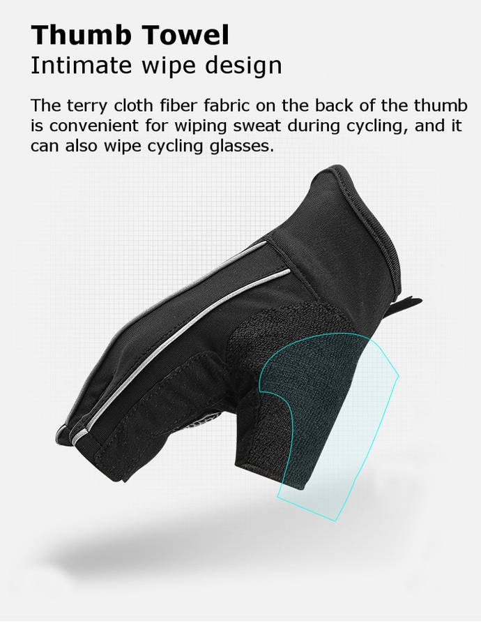 4.Thumb towel, intimate wipe design.The terry cloth fiber fabric on the back of the thumb is convenient for wiping sweat during cycling,