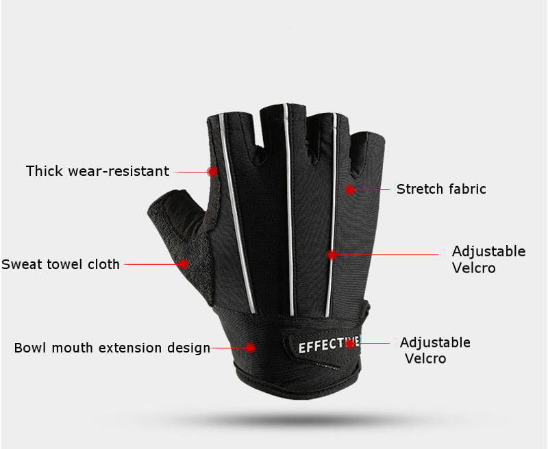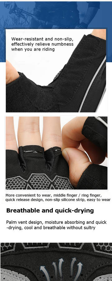 Applicable gender: Unisex Style: Half-finger gloves Material: Wear-resistant fiber leather Advantages: pressurized, breathable, reduced, protection Scope: cycling, fitness and other sports Size: M / L / XL / 2XL