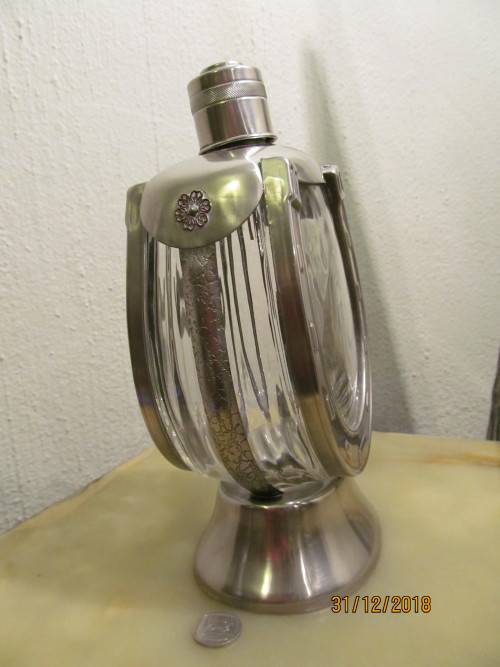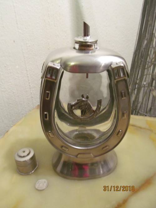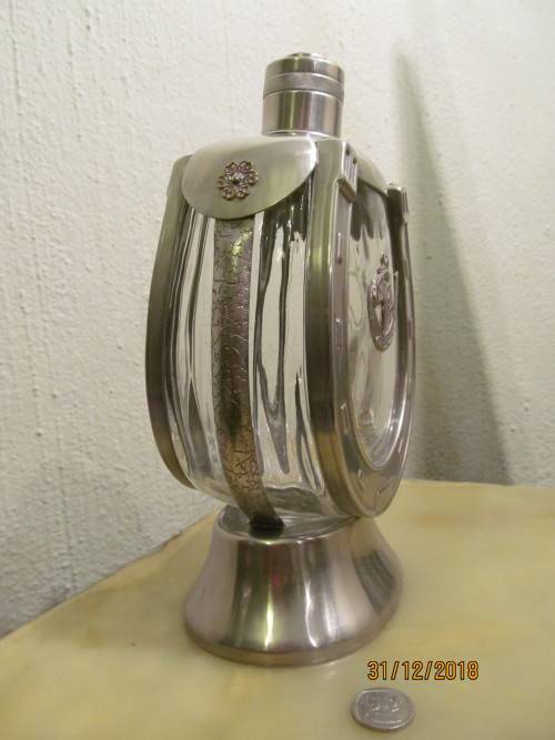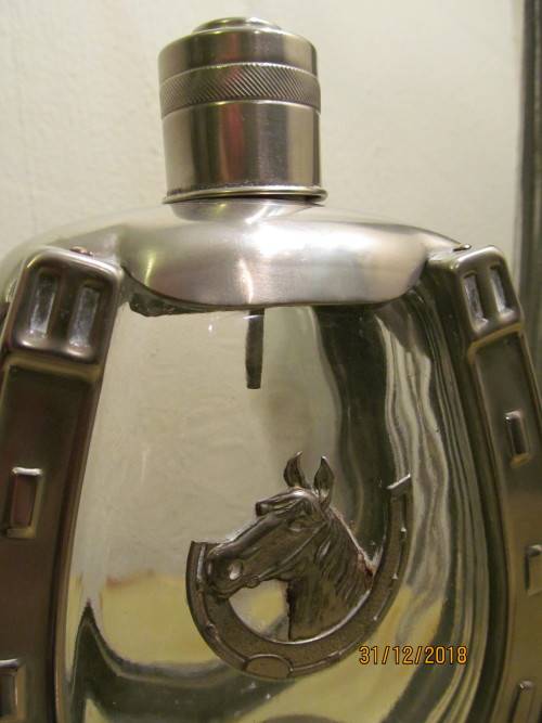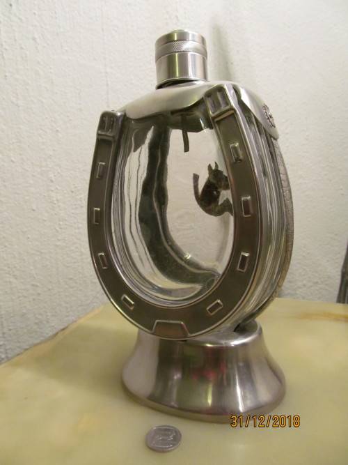 A RARE AND UNIQUE VINTAGE GLASS DECANTER WITH METAL CASING DESIGNED IN A HORSESHOE MOTIF AS WELL AS DECORATED WITH A HORSE HEAD PROFILE. THE DECANTER HAS A STOPPER AND POURER AND IS ATTACHED TO AN ELEVATED PEDESTAL. THE CASING HAS ADDITIONAL SUPPORTS ON THE SIDE IN THE STYLE OF HORSE BELTS