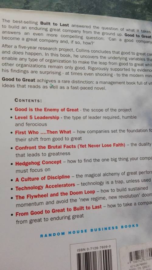 CONTENTS : Good is the Enemy of Great -the scope of the project ; Level 5 Leadership -the type of leader required, humble and ferocious. ; First Who .... Then What - how companies set the foundation for their shift grom good to great. Confront the Brutal Facts ( Yet never lose Faith ) - the duality that leads to greatness ; Hedgehog Concept - how to find the one big thing your company must focus on ; A Culture of Discipline - the magical alchemy of great performance ; Technology Accelerators - technology is a trap , unless used right ; The Flywheel and the Doom Loop - how to build a sustained momentum and avoid the " new regime , new revolution " doom loop ; From Good to Great to Built to Last - how to take a company from great to enduring great .