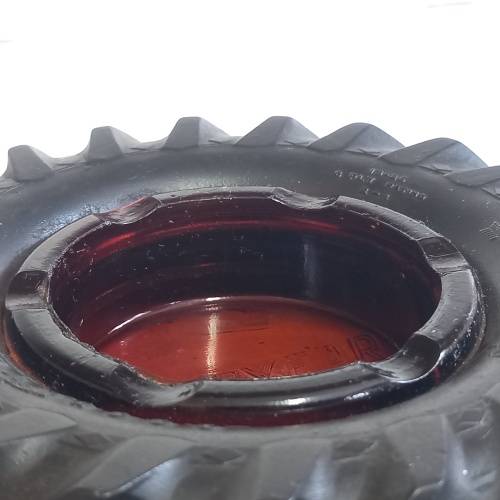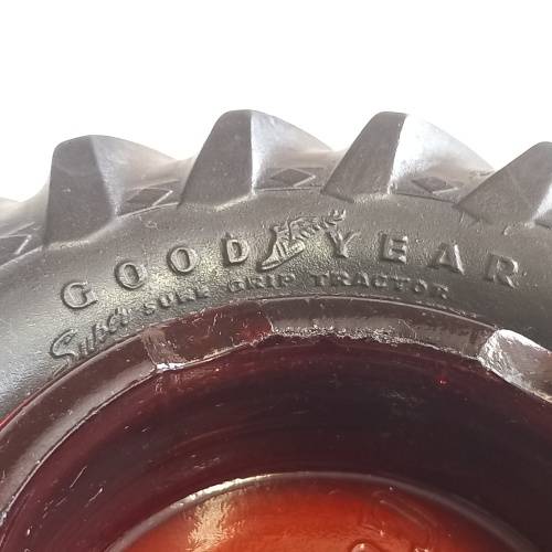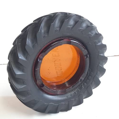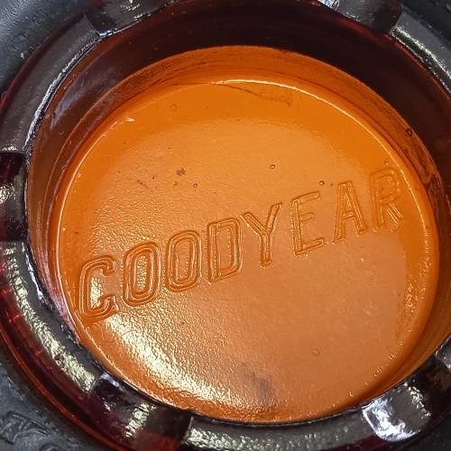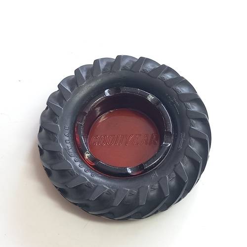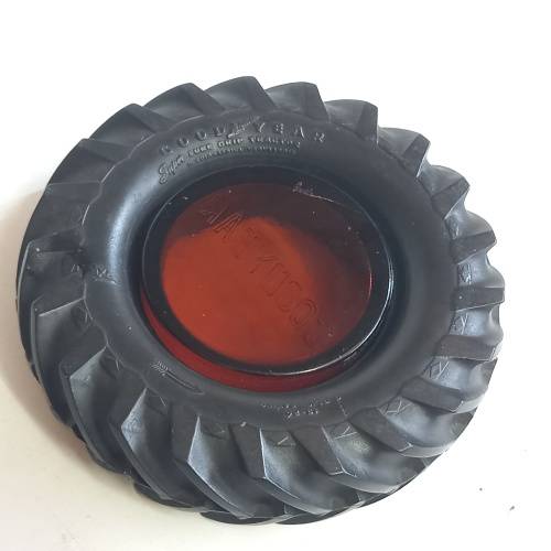 Vintage Goodyear ash tray modelled after the actual Goodyear Super Sure Grip tractor tire is in a very good condition and clearly hallmarked. The ashtray consists of a rubber tire with a Goodyear branded orange coloured glass bowl.