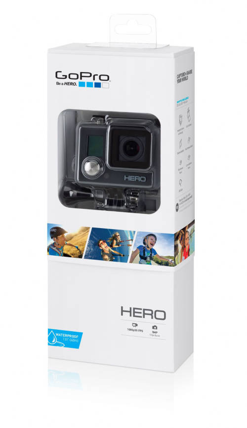 The GoPro HERO is the entry-level version of the latest line of GoPro cameras for 2014/2015. Like the other GoPro cameras, it comes equipped with a waterproof case and a standard GoPro mounting system. This model comes with the open-back as an alternative so it is easier to pick up audio than with the hermetically sealed back (which muffles sound a bit.) Included in the package are two different sticky-tape mounts and a mini USB charging/data cable, some stickers, and a manual. Other accessories purchased separately.