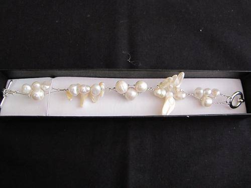 The bracelet consists of genuine freshwater pearls (white) strung together with a alloy metal clasp.
