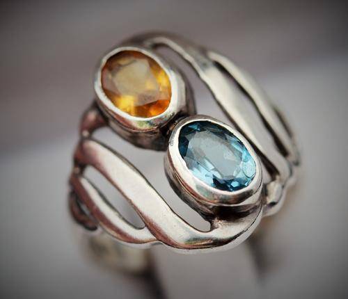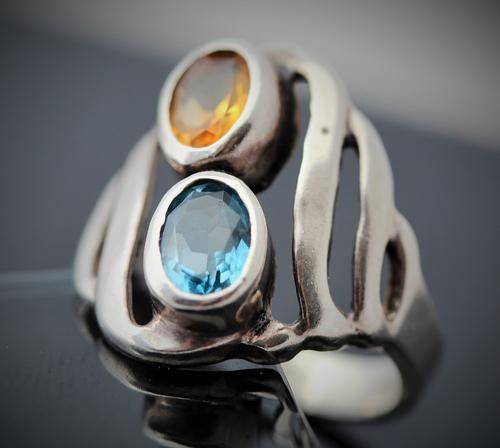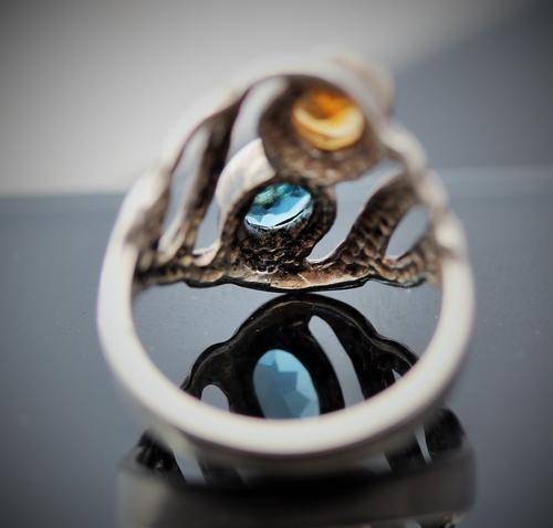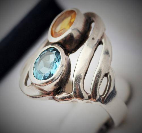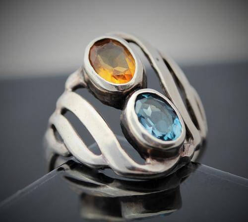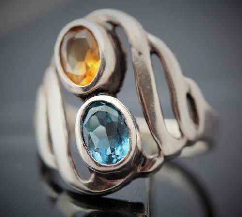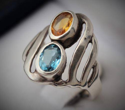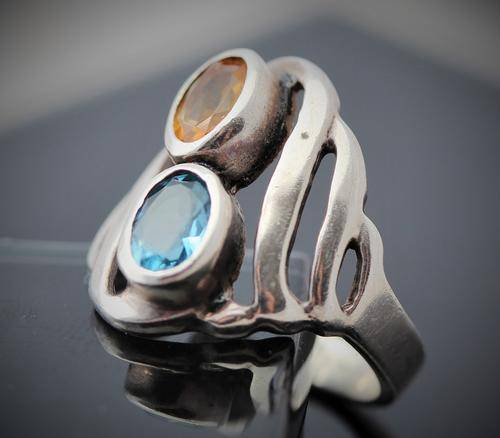 This is a gorgeous and I think unusual, modern sterling silver ring featuring an oval cut blue topaz and citrine gemstone, positioned side by side across the front of an angled ring head. The shoulders of the ring feature an elegant gentle wave pattern. The gemstones are bezel set. The colour combination of the bright blue topaz and the deep fiery citrine makes for a luminous and decorative piece of jewellery. The ring is broad (19mm up the finger) and at 4,7g is a nice solid piece. The ring's bright colours and size make it a particularly striking piece. This ring bears the hallmark '925' for sterling silver and some other interesting hallmarks including the jeweller signature. Its a vintage piece but its in excellent condition with only a few mild buff marks on the silver.