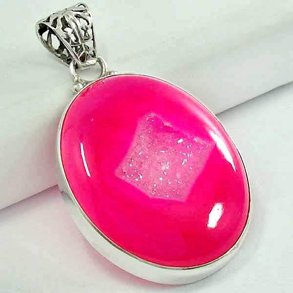 GORGEOUS! BRILLIANT PINK BRAZILIAN AGATE DRUZY STERLING SILVER PENDANT!