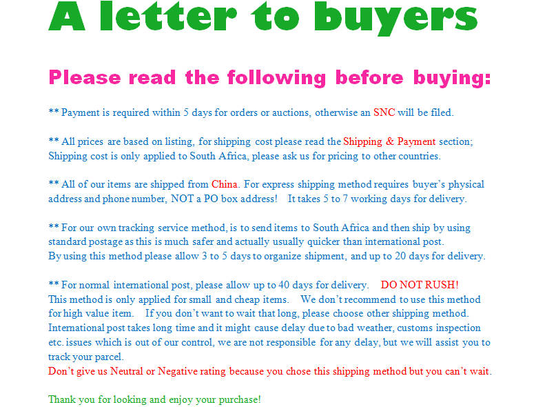 R35.00 Standard shipping using one of our trusted couriers applies to most areas in South Africa. Some areas may attract a R30.00 surcharge. This will be calculated at checkout if applicable.