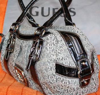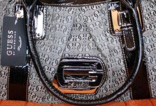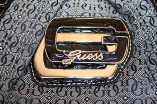 UNUSUAL "G" AND WORD GUESS IN SILVER HARDWARE ON CENTRE FRONT OF HANDBAG.