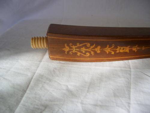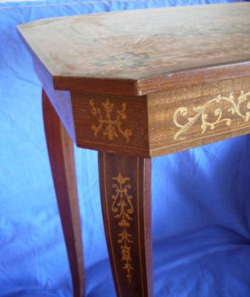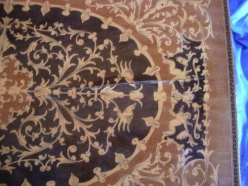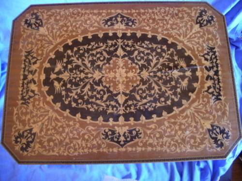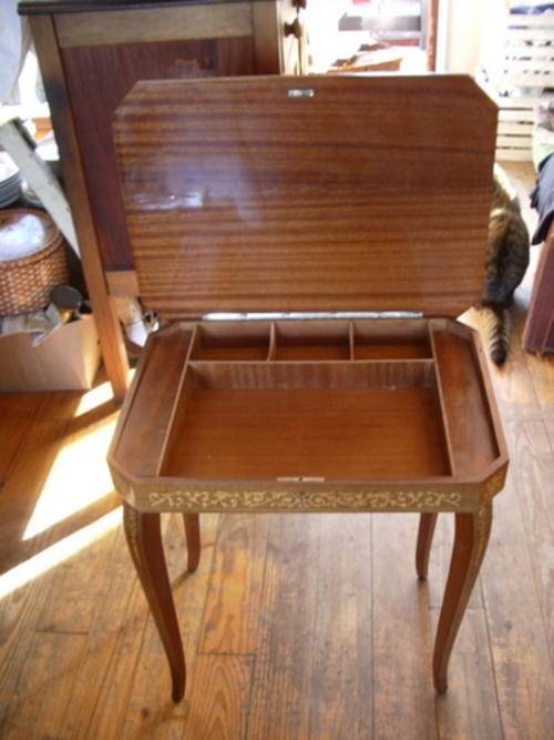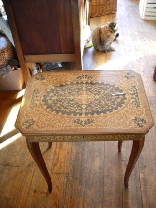 The only thing I can really see that is wrong is a crack in the veneer, as shown on the photos. The four legs all screw on, and the lock has its original key and the musical works work. This is a total beauty and very functional at the same time. If turned around, so keyhole isn't visible it would just look like a little table. These were made as needle work tables, but would make a lovely jewellery box as well.