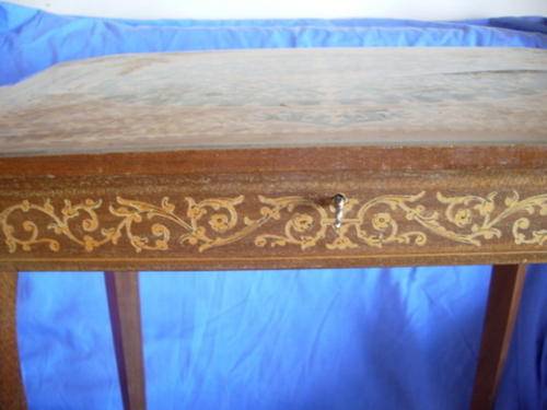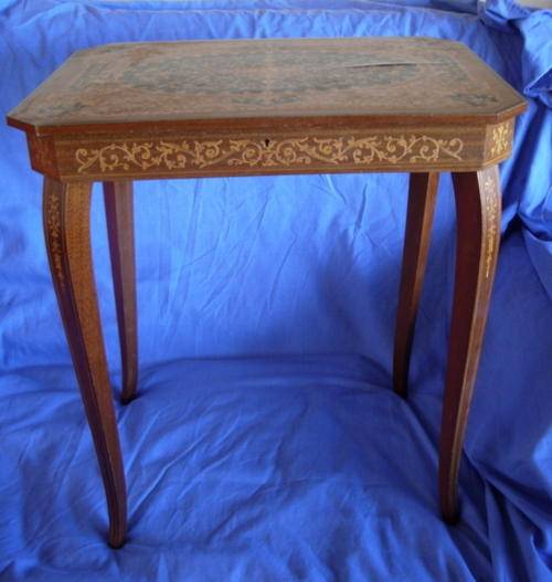 GORGEOUS INLAID NEEDLEWORK BOX AND TABLE WITH MUSICAL WORKS AND WORKING LOCK - STUNNING