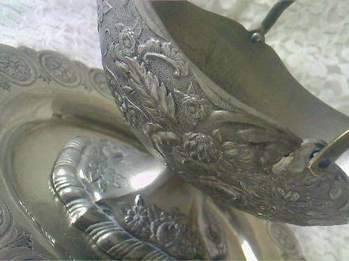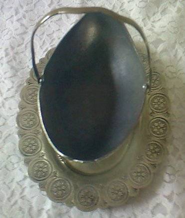 This beautiful little footed candy bowl has a brass swing handle and lovely raised floral decoration. The inside of the bowl shows signs of frequent use. I have paired this bowl with a plated underplate with compliments it nicely. The underplate also shows considerable signs of wear. The candy bowl measures 8.5cm in height and 14x9cm. The underplate measures 19x15.5.