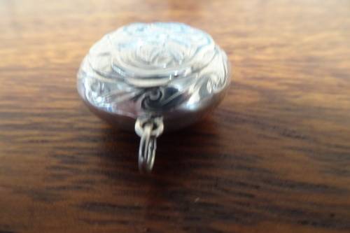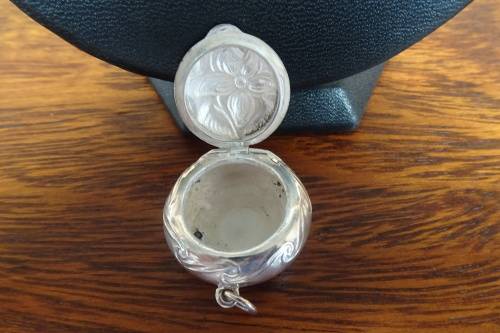 A gorgeous puffy locket with pretty embossed flower and leaf design, destined to become a long-treasured keepsake. This beauty has all the charm and nostalgia of an heirloom for generations to come. This locket closes securely and has sufficient depth to hold small, lightweight items. It hangs from a round ring. I cannot find a 925 stamp, but it has been tested for silver with results being positive but not 100 % guaranteed. The locket has a smooth, plain reverse side.