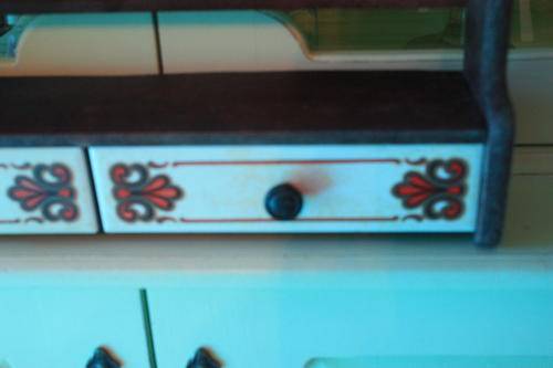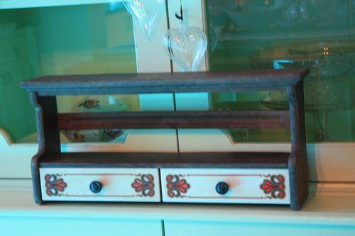 Deliciously retro and fun flowery melamine (has the appearance of wood) spice herb rack with 2 drawers. Charming design in shades of orange and olive green, on a cream background. A really nice and cheerful decorative addition to any retro kitchen.