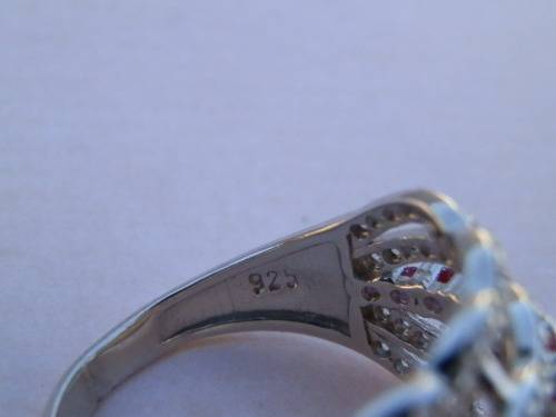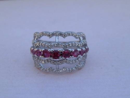 Fabulous sterling silver ruby ring with clear stone accent, marked 925 and in new condition. The size is N / 7, top width 14 mm and the weight 4.2 g. The hardness of the 15 rubies is 9 on the MOHS scale. Awesome!!
