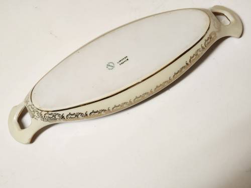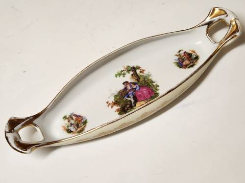 GORGEOUS VINTAGE AND RARE LIMOGES FRANCE GONDOLA SHAPED TWIN HANDLED PORCELAIN OLIVE DISH. IT IS IN A GOOD CONDITION WITH NO CHIPS OR CRACKS AND WITH SOME LOSS OF THE GOLD FEATURES ON THE HANDLES. THE DISH MEASURE 29 CM LONG, 3.5 CM HIGH AND 10 CM AT THE WIDEST POINT.