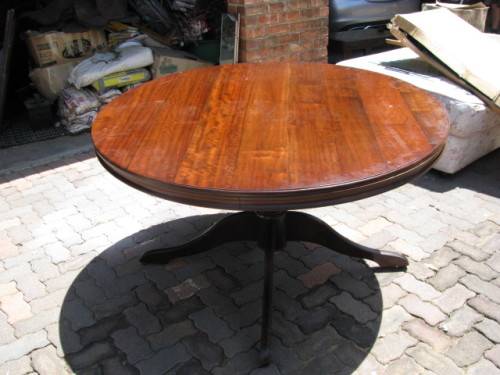 A VINTAGE MAHOGANY ROUND TABLE WITH CENTRAL COLUMN AND BRASS ENCLOSED FEET.......BEAUTIFUL ITEM OF GOOD QUALITY. THIS IS PERFECT FOR THAT LARGE ENTRANCE HALL...IN THE KITCHEN OR IN THE HOME TO DINE AT...A LOVELY ITEM