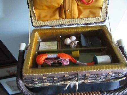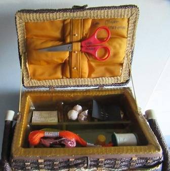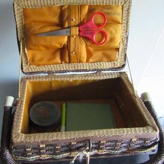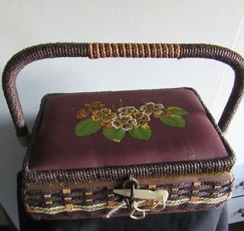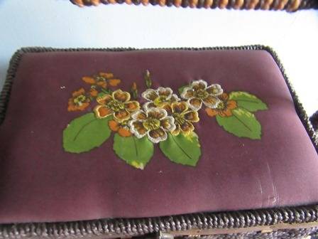Stunning Vintage rattan sewing basket with padded lid with applique flowers and some vintage sewing items inside the basket with a plastic tray. The basket is 23cm x 15cm x 24cm high incl. handle.
