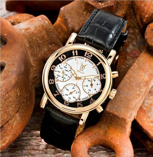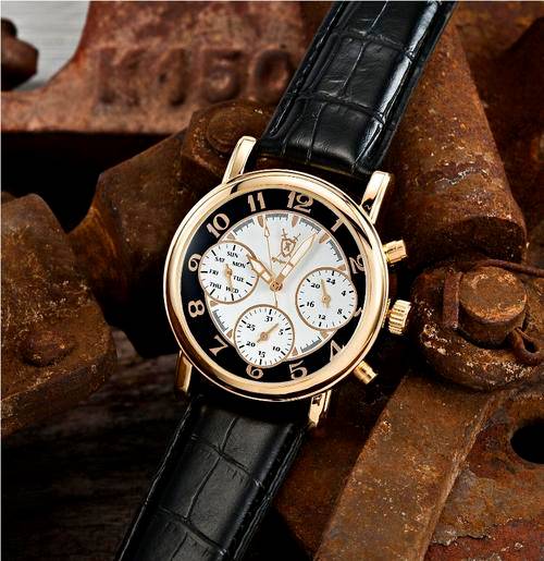 Shield of kings logo on the white gold black colored dial