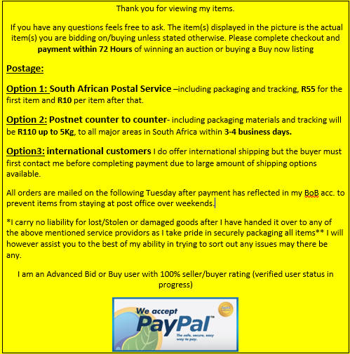 Free shipping is available from nicholasmiller56 for all orders above R2,000.00, using one of our trusted couriers. Check my rate