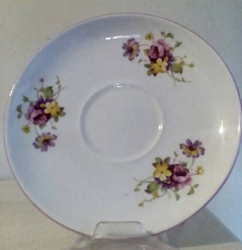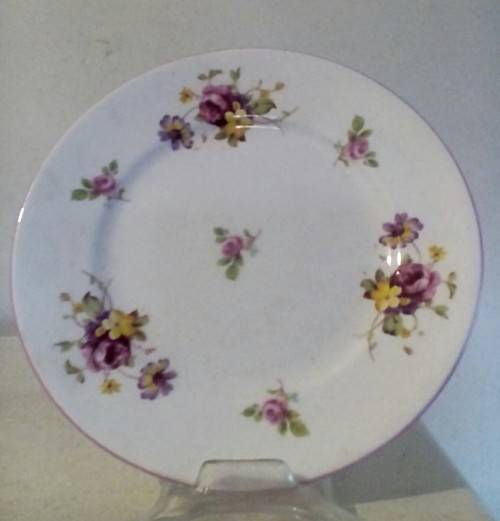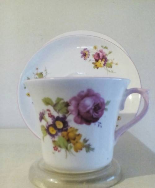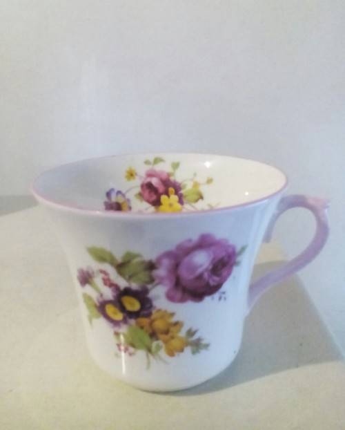 Extra fine porcelain tea trio by Shelley. White body decorated profusely with sprays of mixed flowers. Hand painted baby pink edges. Side plate measures 153mm across. Saucer measures 140mm across. Cup measures 72mm high and 85mm across the top. Stamped Shelley, fine bone china and England to base. In good vintage condition.