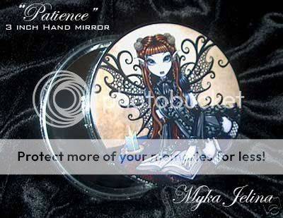 GOTHIC FAIRY ARTIST MYKA JELINA HANDBAG MIRROR These gorgeous little mirrors are hand pressed by the original artist. They are cute 75mm round pocket mirrors that have a perfect replica of the original work of art on one side and a mirror on the other. The front shell is made of metal and the glossy print inside is protected by a crystal clear sheet of mylar. They are perfect to just drop in your purse or back pack for those little touch ups on the go. Terms