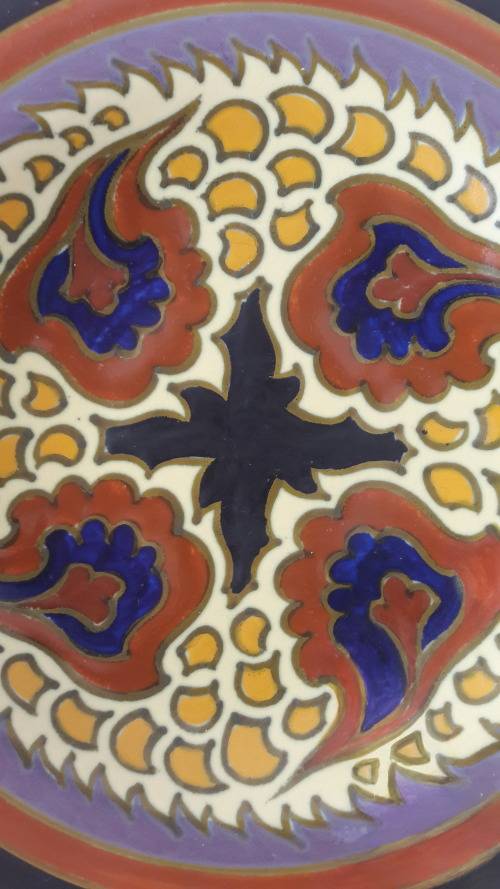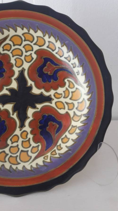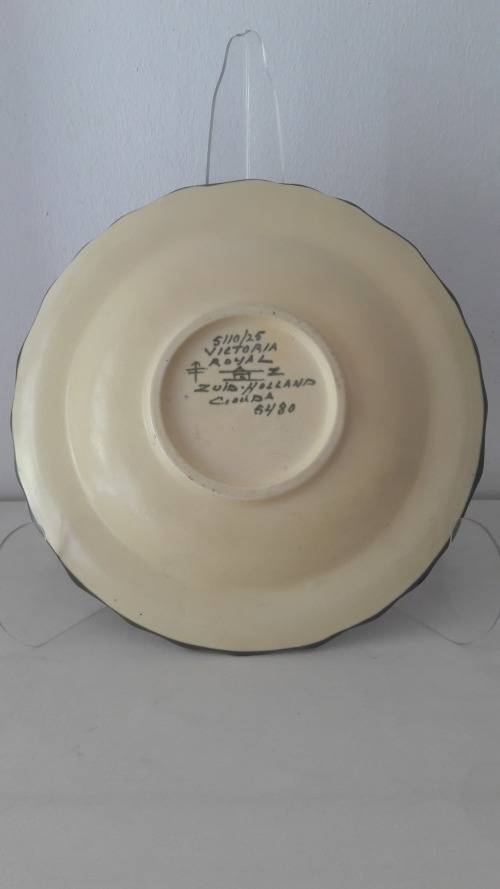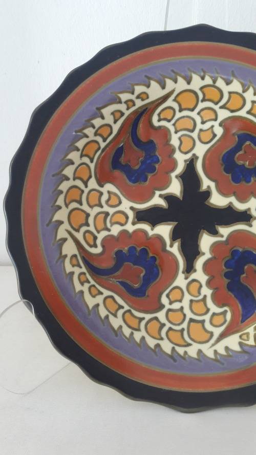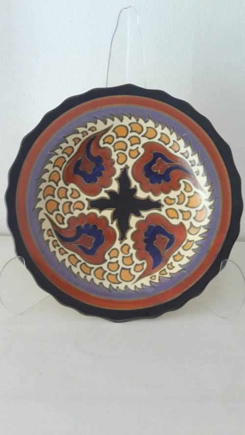 Offered for sale is an attractive and vibrant Dutch ceramic wall plate or charger made by the famous PZH company Plateelbakkerij Zuid Holland in the Gouda district of the Netherlands in 1931. The plate is in the eye catching Victoria Royal pattern with a well balanced abstract motifs inspired by floral and plant forms. The plate is earthenware hand painted in a palette including black , brick red, pale cream, olive green , mauve , midnight blue and butternut. The reverse of the platter is glazed in a pale cream colour. The plate is 25cm wide slightly convex with an undulating rim. The back of the plate has hand painted marks including the manufacturers logo/cypher the famous "little house", the painters initial Z, Zuid Holland Gouda, the pattern name Victoria Royal , serial numbers which refer to the shape/form and pattern/decor name and the date mark which looks like a spear with 2 cross bars.