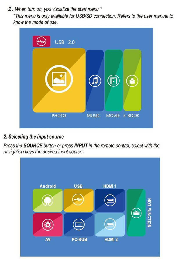 | Multi-interface contains (Input/Output) | Input Interface: 2 x HDMI Port, 1 x VGA/PC-RGB, 1 x AV/Video, 1 x USB A(Ready), 1 x SD Card-ready. TV Tuner(Different versions of ATV or DTV) Output Interface: 3.5mm stereo/Audio Out |