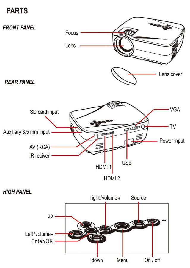 | main parameters | Product Type: Simple Beamer, LED toy projector, micro projector,mini projector,portable projector,home theater projector. Projector feature: LED, Portable low cost Projection Technology: Single TFT-LCD panel with LED light source Brightness 1,200 lumens (nominal) value of brightness uniformity of 90% 600: 1 Static, Dynamic up to 10,000: 1 Contrast ratio Physical Resolution 800*480Pixels, Optical resolution up to Full HD-Level / 1920x1080Pixels |