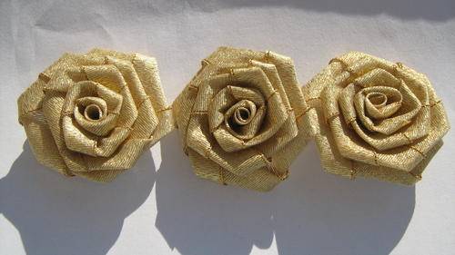 3 gold coloured organza cloth roses diameter 40mm length 40mm