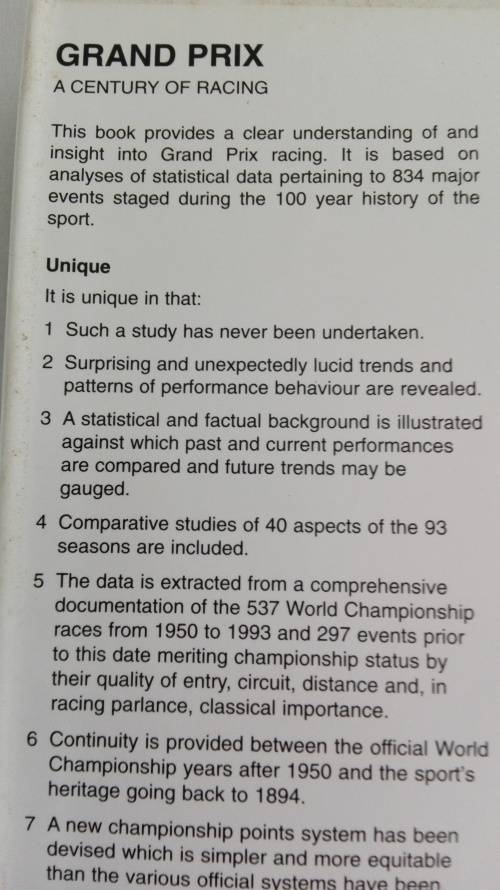 GRAND PRIX A Century of Racing by PATRICK O'BRIEN ; A A Racing Kyalami : Hardcover First Edition Published by AA Racing ( PTY) Ltd.South Africa1994 ISBN 090923440 X No of PAGES ; 224 ( motor sport )
