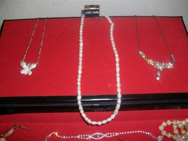 kindly note postage will be R55,Grannys treasure chest filled with vintage and other costume jewellery also some ivory items in the lot this lot consists of , fresh water pearls necklace, butterfly costume necklace , crystal honey type necklace, semi precious stone bangle, ivory brooch, ivory ring , costume pearls the pearls are worn, purple booch, and some interesting pendants and religious cross nice find with the box, as per pictures for one bid