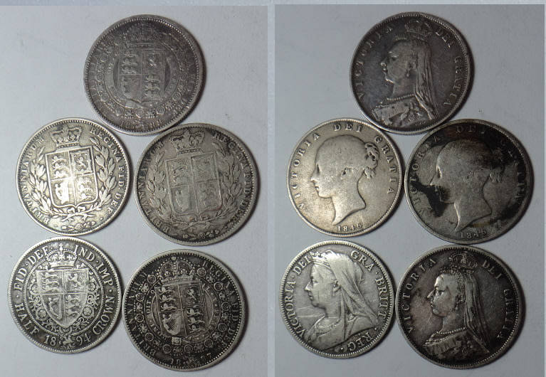 You are bidding here on collection of 5 sterling silver Half Crowns being 2 x 1846, 1887, 1888 and 1894.