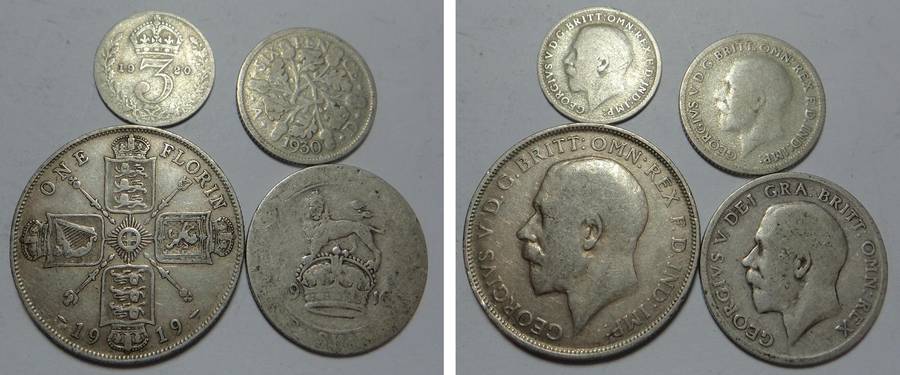 The dates are: - 3-pence (1920) 6-pence (1930) Shilling (1916) and Florin (1919).