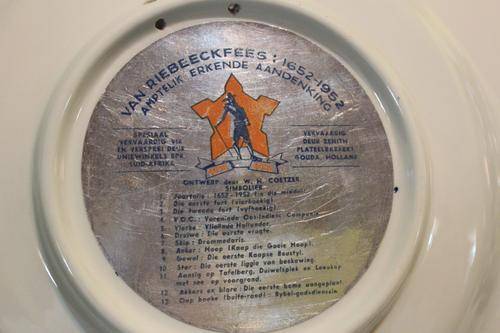 RARE COMMEMORATIVE PLATE OF JAN VAN RIEBEECK'S ARRIVAL IN THE CAPE! Made by Zenith in GOUDA, Holland, designed by W.H. Coetzer. 29cm in diameter.