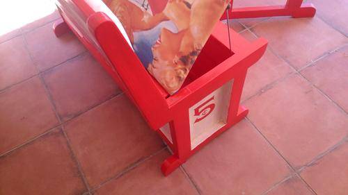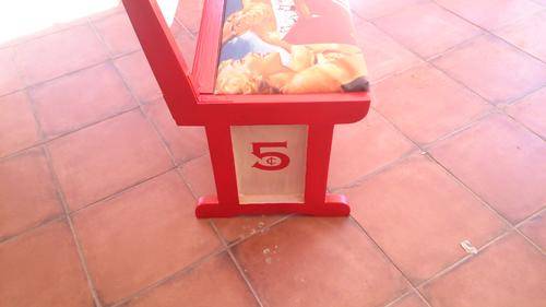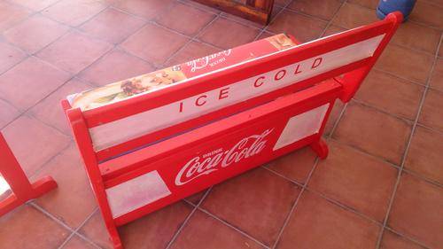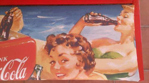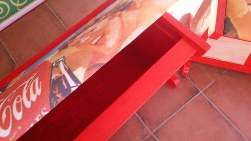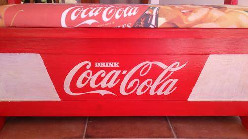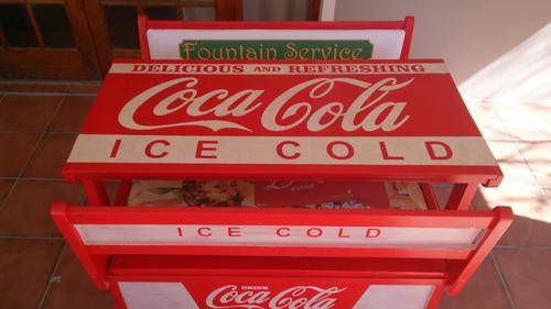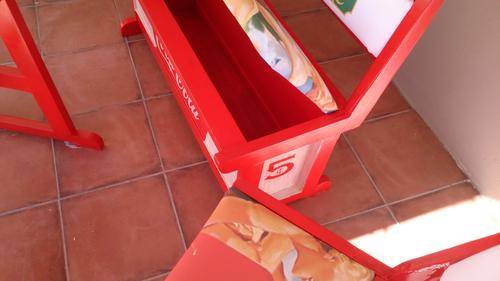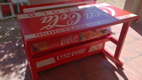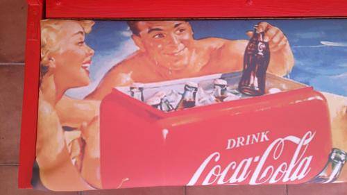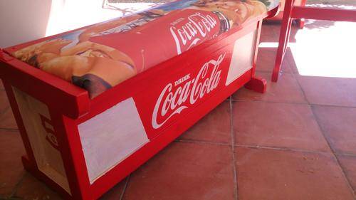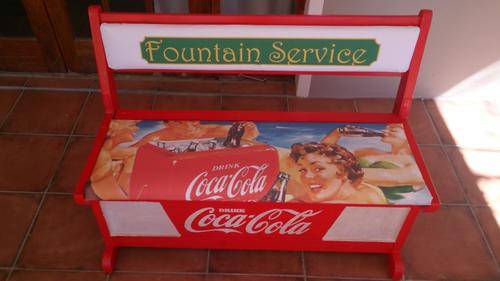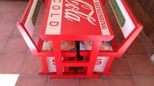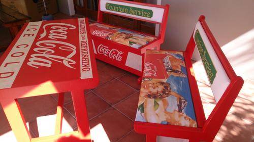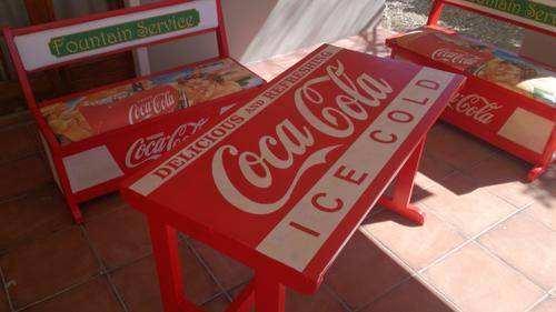 Stunning table for your party area! Solid wood table and chairs, refurbished and painted by hand. All the logos was done by hand, and the seats upholstered with canvas prints of vintage Coca Cola adverts. Seats also double as storage space, and gives you plenty of room to store your braai/party accessories.