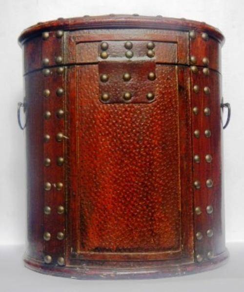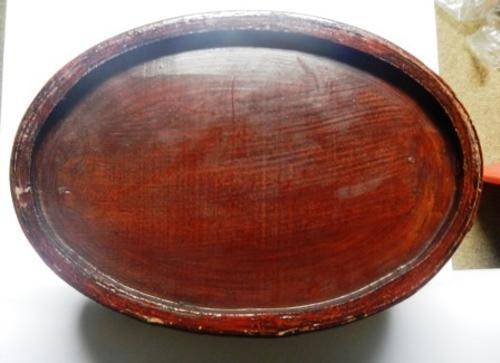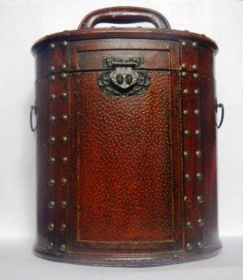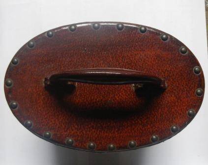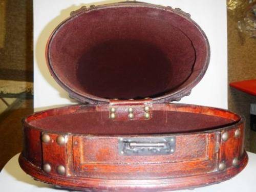 Great looking oval case constructed out of steamed wood. Has leather trim on front and back.