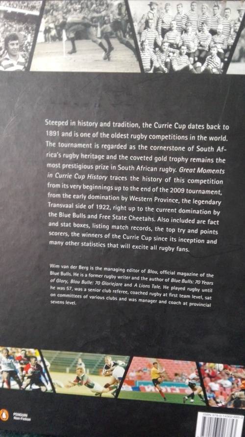GREAT MOMENTS IN CURRIE CUP HISTORY by Wim van der Berg ( Rugby ) ; Hardcover published by Penguin Books 2010 ISBN 978 0 143 02685 3 ; No. of Pages ;194