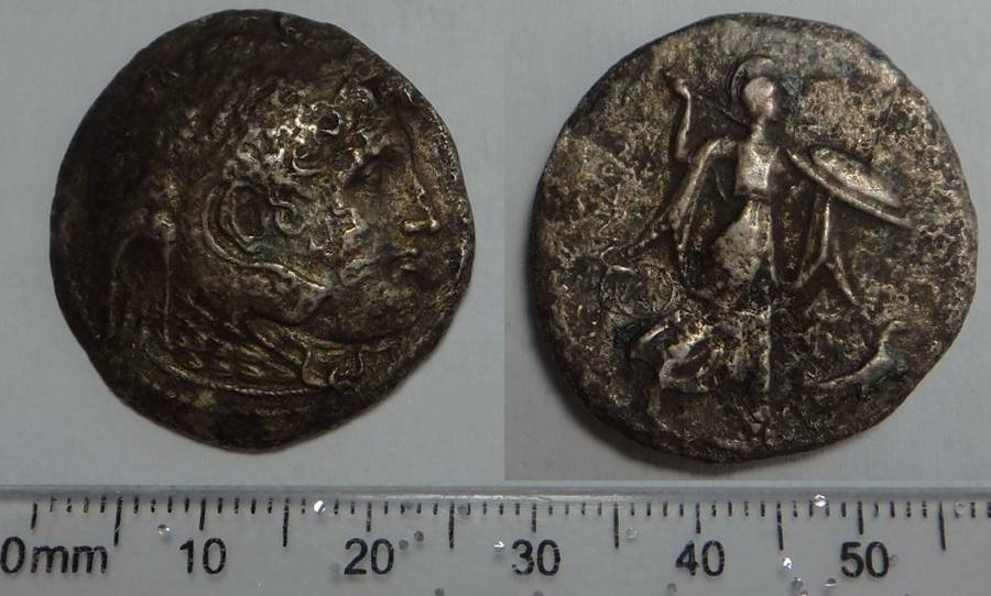 The obverse shows Alexander the Great wearing an animal skin. The reverse shows Athena Alkidemos advancing to the right holding a spear and shield.