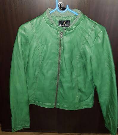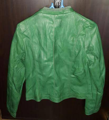 This jacket has never been worn. Green leather look jacket, very flattering cut and fit. Its labelled size Large, although its a small make. It comfortably fits S to M.