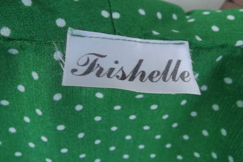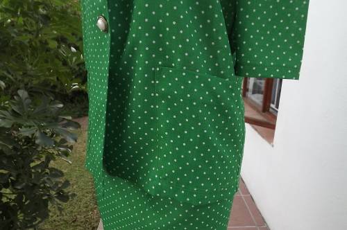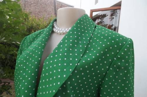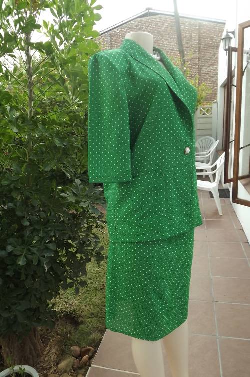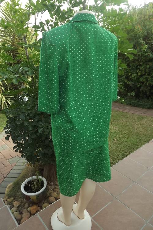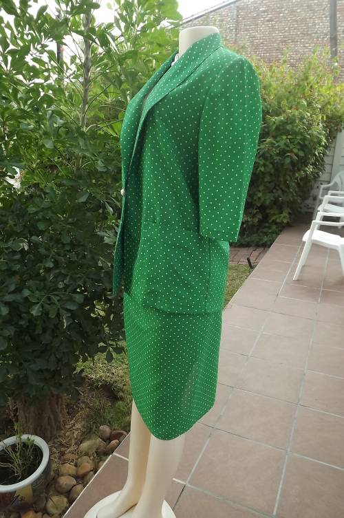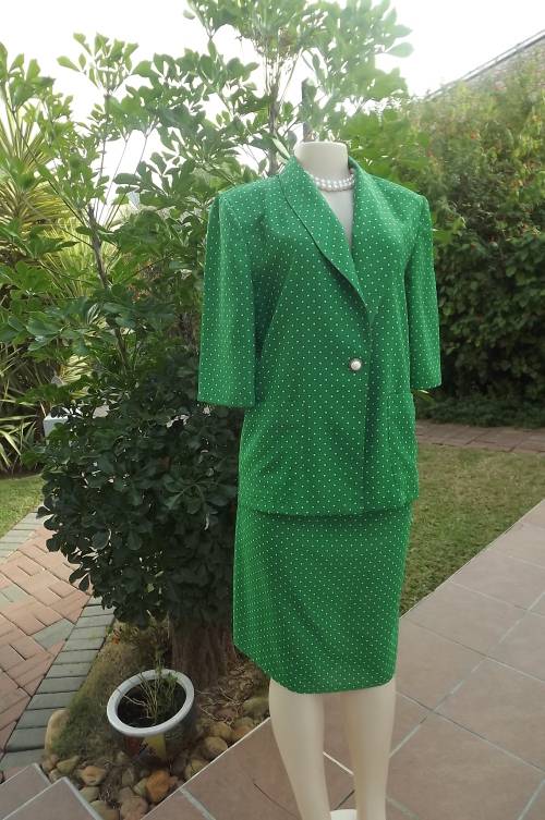 Green polka dot piece skirt suit in polyester/rayon fabric.Size 36/12.Skirt with elasticated middle.By Frishelle. Elegant short sleeve jacket with 2 front pockets.Close with button on front.New condition