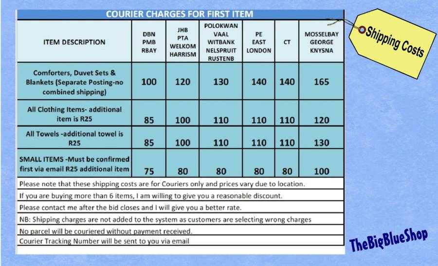 R65.00 Standard shipping applies to orders under R100.00, in most areas in South Africa. R35.00 Standard shipping applies to orders over R100.00. Some areas may attract a surcharge surcharge. This will be calculated at checkout if applicable.