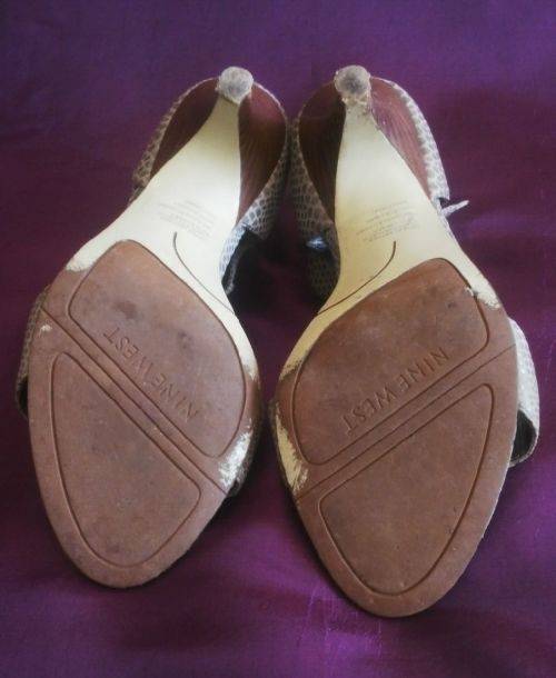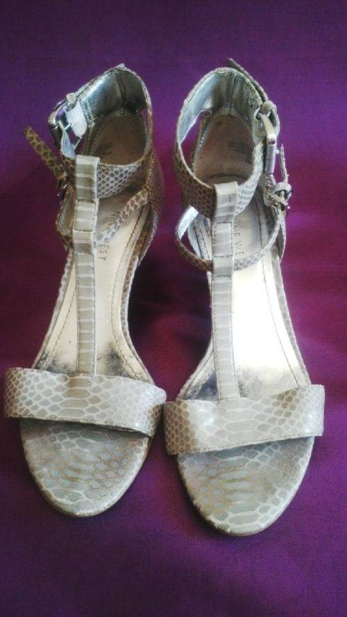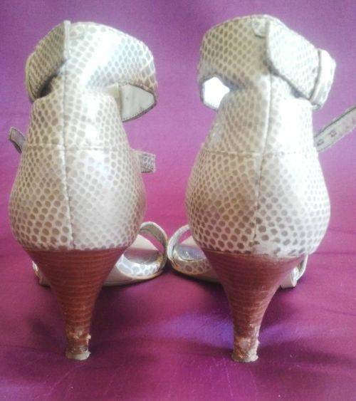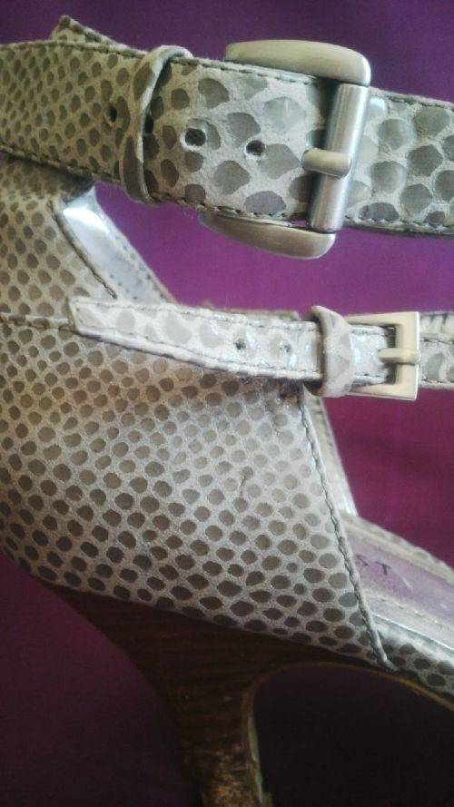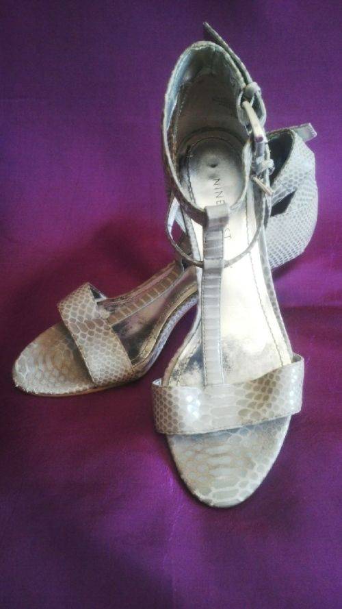 Grey snake skin look sandals, with 2 ankle straps by Nine West (Heels are quite scratched see pic) but still a gorgeous pair of sandals in good condition.
