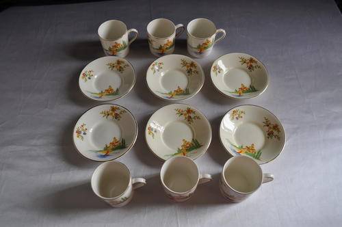 Cups 5,5cm in height, 5cm in diam. Saucers 10,5cm in diam. Sugar bowl 4,5cm in height, 7,5cm in diam. marks to the base see pic. Milk Jug 7cm in height. Coffee pot 16cm spout to handle. 17,5cm in height incl lid.