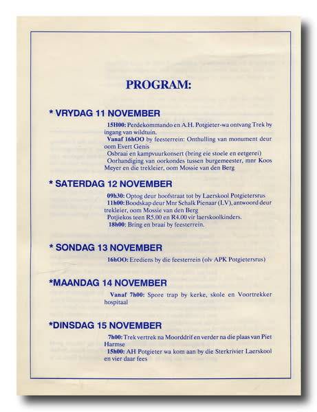 Groot Trek 150 - Potgietersrus (11-14 Nov 1988).  A4, "Staple"-boek, 8 bls. Program in goeie toestand.